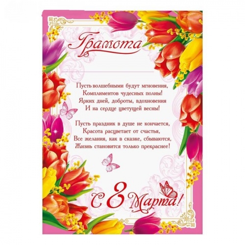 Грамота "8 марта", тюльпаны, с текстом, 21х29,7 см 1984345