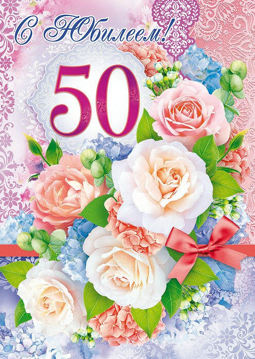 Открытка А4 С Юбилеем 50! Цветы и бантик